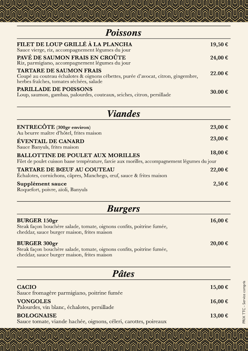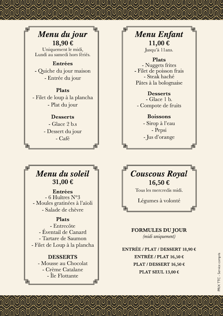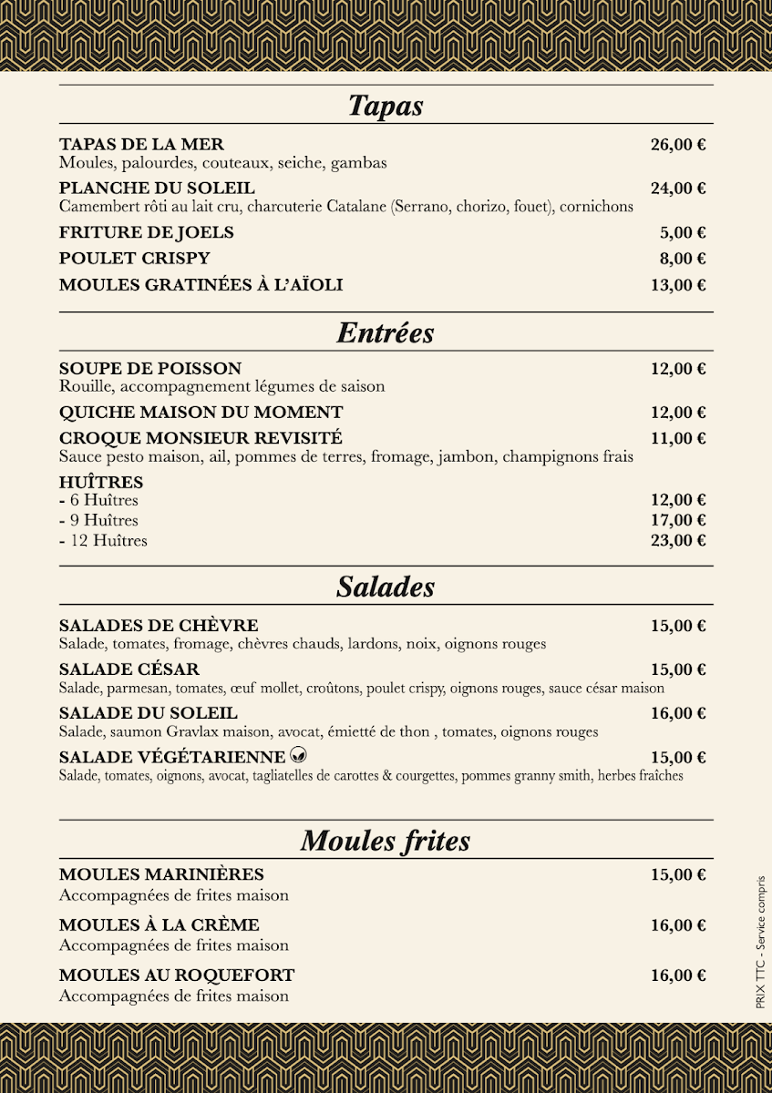 La Brasserie du Soleil, nestled along the picturesque Promenade de la Côte Radieuse in Canet-en-Roussillon, offers a delightful menu that captures the essence of French brasserie cuisine with a coastal twist. The menu du jour, affordably priced between €18 and €20, presents a balanced selection of entrées, main dishes, and desserts, thoughtfully designed to satisfy diverse palates.